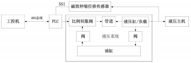 上述液壓系統(tǒng)由驅(qū)動液壓站、液壓機主機、同步液壓站和液壓管路組成;驅(qū)動液壓站、液壓機主機和同步液壓站通過液壓管路相連,壓力傳感器安裝于驅(qū)動液壓站與同步液壓站出口處,磁致伸縮位移傳感器安裝于液壓機主機,壓力傳感器和磁致伸縮位移傳感器的檢測信號輸入到數(shù)據(jù)采集檢測系統(tǒng)的輸入端,數(shù)據(jù)采集檢測系統(tǒng)的輸出端將這些檢測信號上傳到PLC控制系統(tǒng)的輸入端,PLC控制系統(tǒng)的輸出端再將控制信號傳送到驅(qū)動液壓站和同步液壓站。