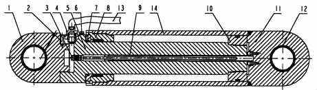 圖中,l前端耳環(huán);2錐銷(xiāo);3磁致伸縮位移傳感器;4線接頭;5活塞桿;6油路接頭;7壓蓋; 8端蓋;9磁環(huán)支撐架;10活塞;11缸底耳環(huán);12襯套;13液壓膠管;14缸體。
