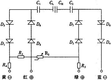 現(xiàn)在我們用萬用表正極接紅線,負(fù)極接黃線,其串聯(lián)回路D1 D2 D5 D6 R4阻值之和應(yīng)與測綠線與藍(lán)線的串聯(lián)回路D3 D4 D7 D8 R5的阻值之和接近或相等.